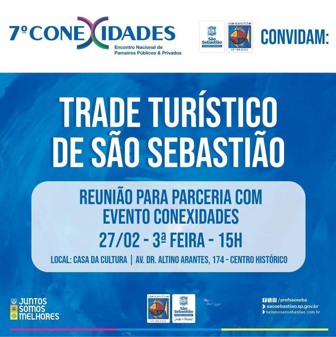 A Prefeitura de São Sebastião, por meio da Secretaria de Turismo (SETUR), e a organização do evento Conexidades convida todo o trade turístico do município para participar da reunião de alinhamento sobre o Encontro Nacional de Parceiros Públicos e Privados – Conexidades, previsto para ocorrer de 4 a 8 de junho de 2024, no município de São Sebastião.