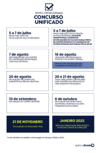 Segundo o cronograma do MGI, os cadernos com as questões das provas dos oito blocos do concurso devem estar disponíveis ao público a partir das 20h deste domingo (18). O gabarito oficial preliminar das provas objetivas sairá na terça-feira (20). Após a divulgação, os candidatos terão os dias 20 e 21 de agosto para recorrer de alguma questão.