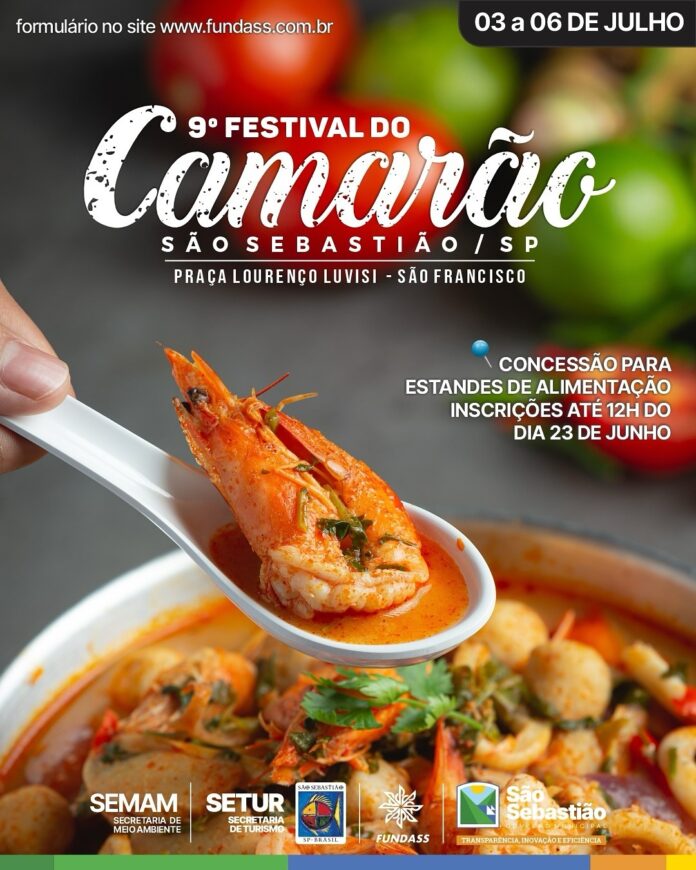 A Prefeitura de São Sebastião está com inscrições abertas para a concessão de estandes destinados à comercialização de alimentos durante a 9ª edição do tradicional Festival do Camarão, que será realizado de 3 a 6 de julho, na Praça Lourenço Luvisi (Praça do Convento), no bairro de São Francisco — a maior comunidade pesqueira do município.