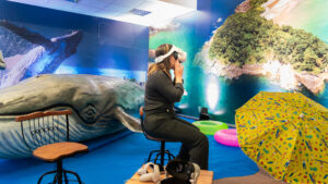 Quem visitar o lounge poderá viver uma experiência imersiva em 360 graus com óculos de realidade virtual, com avistamentos das baleias-jubarte em São Sebastião. O espaço também conta com atendimento ao público e distribuição de folhetos turísticos, promovendo os atrativos do município como destino.