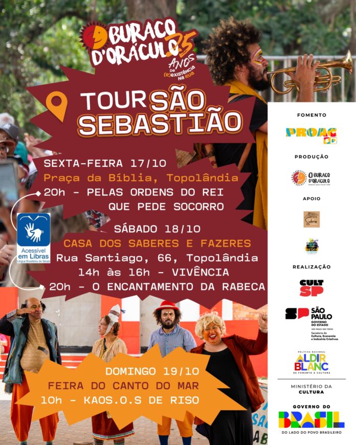 O grupo Buraco d’Oráculo, reconhecido por sua trajetória de resistência e arte nas ruas, chega a São Sebastião neste fim de semana com uma programação especial para celebrar seus 25 anos de (Re)Existência na Rua. As atividades fazem parte do Tour São Sebastião, que ocorre entre os dias 17 e 19 de outubro, com apresentações e vivências culturais em diferentes pontos da cidade.