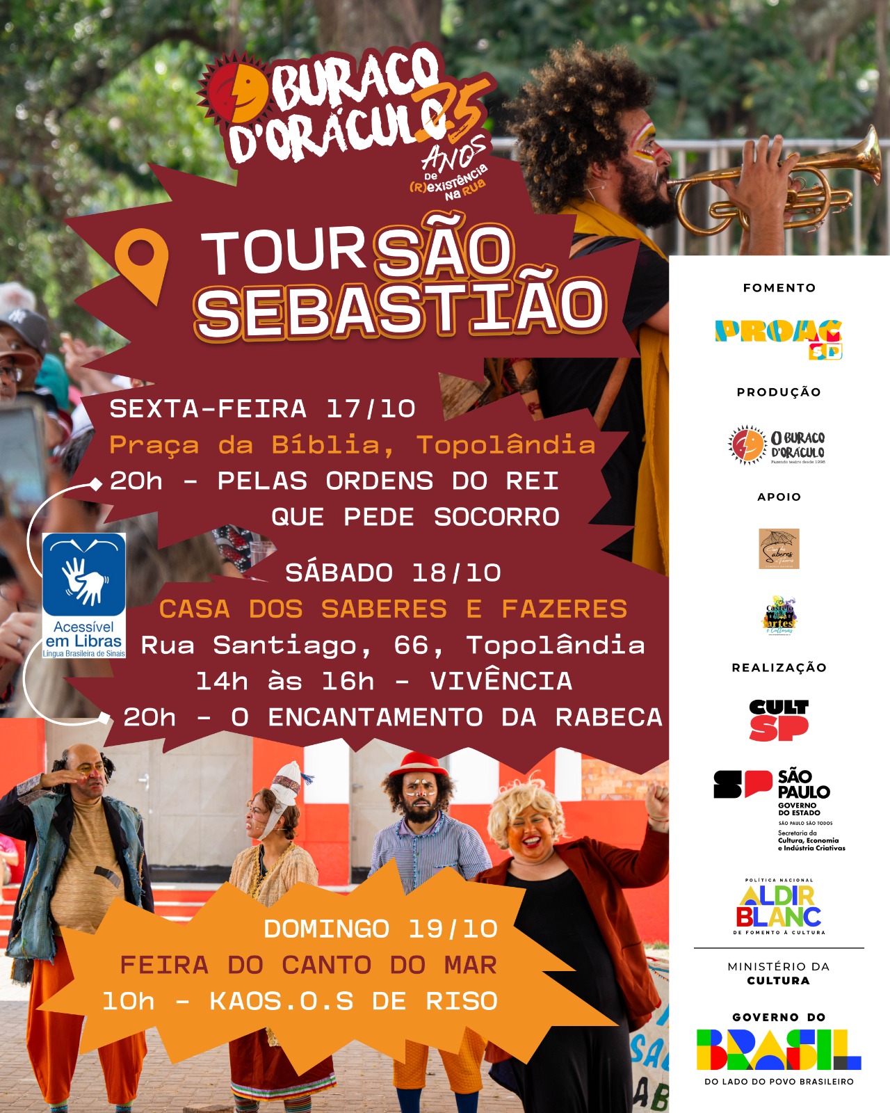 Com 25 anos de trajetória, o Buraco d’Oráculo se consolidou como uma das referências do teatro de rua em São Paulo, levando arte, reflexão e poesia para praças, feiras e comunidades. O projeto conta com fomento do ProAC, apoio do Governo do Estado de São Paulo, Ministério da Cultura e Política Nacional Aldir Blanc de Fomento à Cultura.