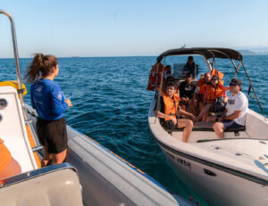 – Observe o comportamento da baleia: se ela estiver seguindo seu caminho, não a bloqueie. Se ela se aproximar do barco, mantenha sua posição, sem engatar o motor.