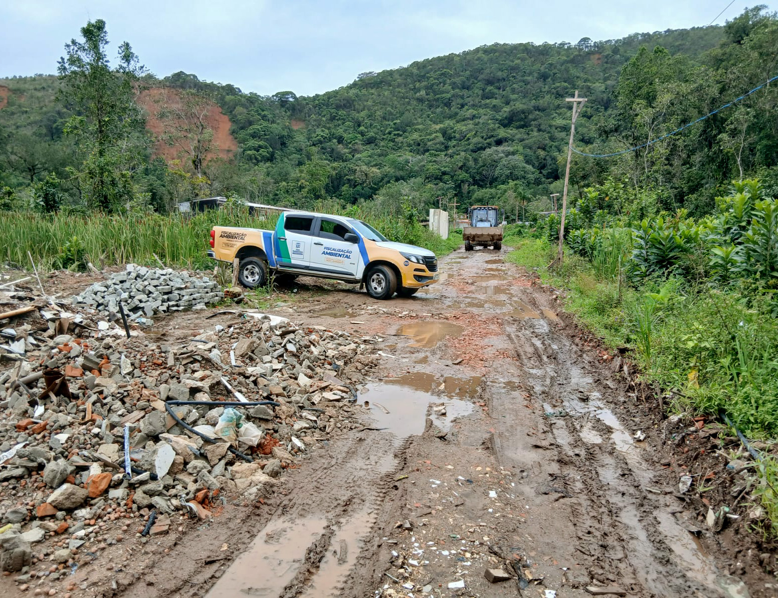 No primeiro ponto vistoriado, as equipes constataram abertura de via com aterro, retirada de vegetação e descarte de resíduos de poda e construção civil. Foram identificadas, ainda, cercas demarcando lotes destinados a futuras construções irregulares.
