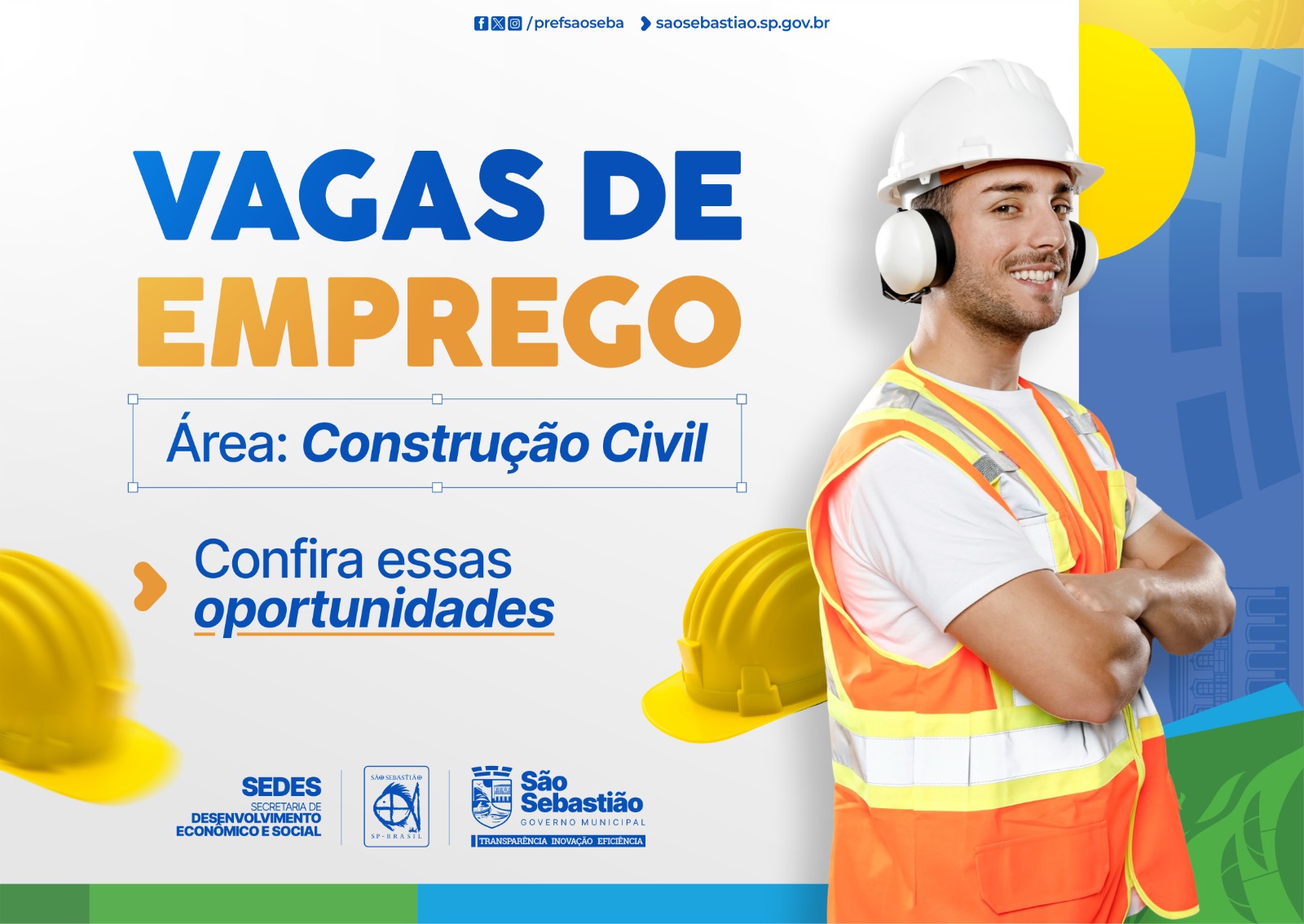 Estão disponíveis vagas para ajudante de obras, armador, carpinteiro, encanador, motorista de caminhão, operador de escavadeira hidráulica, operador de motoniveladora, operador de retroescavadeira e pedreiro.