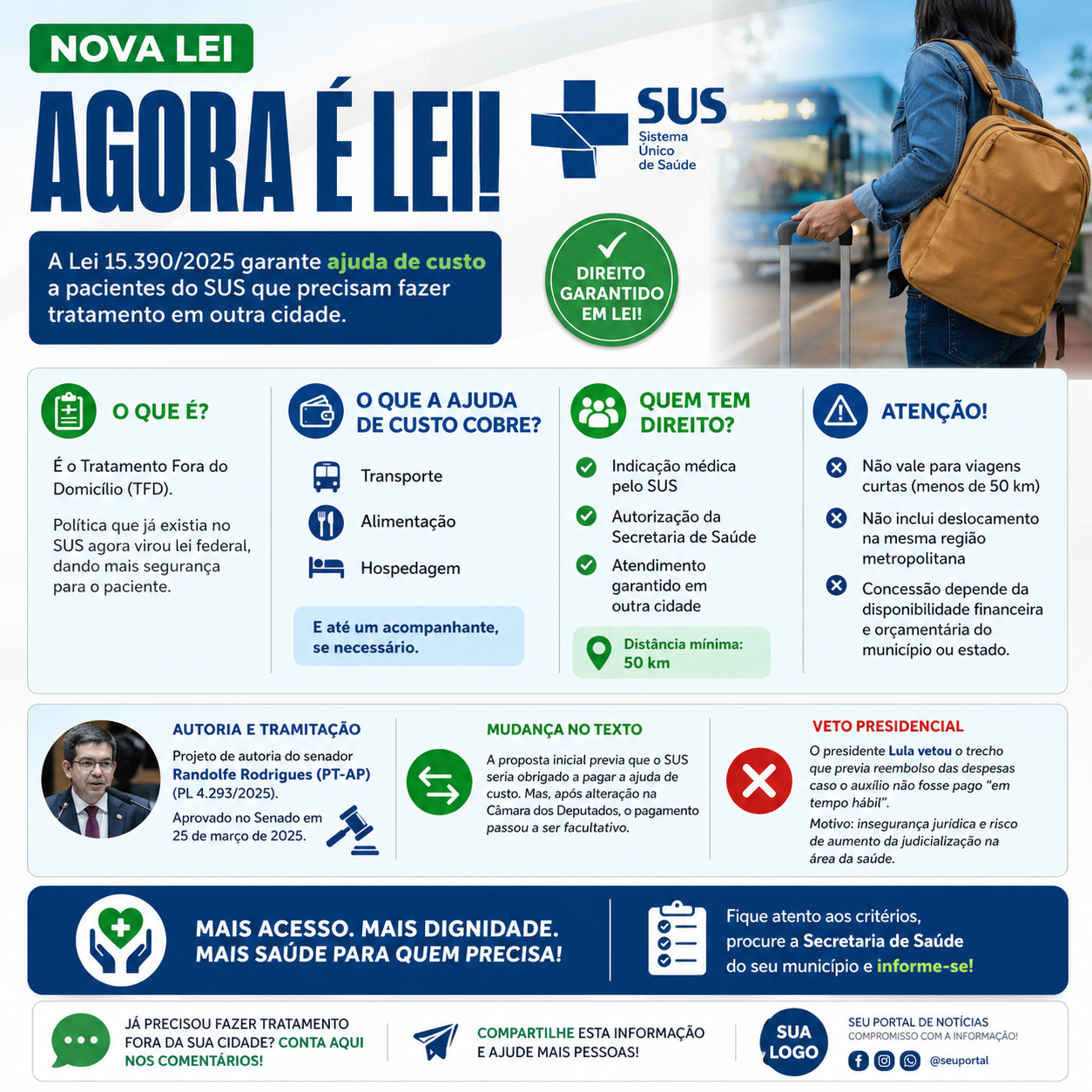Uma importante medida voltada ao acesso à saúde pública no Brasil acaba de ser oficializada. Foi sancionada a Lei nº 15.390/2025, que assegura o direito à ajuda de custo para pacientes do Sistema Único de Saúde (SUS) que precisam se deslocar para realizar tratamento em outra cidade.