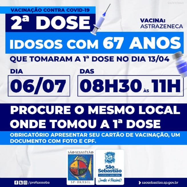 A Prefeitura Municipal de São Sebastião, por meio da Secretaria Municipal de Saúde (SESAU) e da Fundação de Saúde Pública (FSPSS), informa que nesta terça-feira (6), das 8h30 às 11h, o público-alvo da campanha de vacinação contra a Covid-19 serão os idosos com 67 anos que receberam a primeira dose do imunizante no dia 13 de abril, com a vacina Astrazeneca.