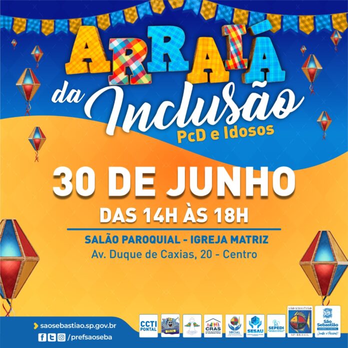 A Prefeitura de São Sebastião, por meio das secretarias da Pessoa com Deficiência e do Idoso (SEPEDI), Educação (SEDUC), Desenvolvimento Econômico e Social (SEDES) – Centro de Referência de Assistência Social (CRAS) – Saúde (SESAU), Centro de Atenção Psicossocial (CAPS I), centros de reabilitação Topolândia e Boiçucanga, em parceria com a Associação Anjo Azul, Centro de Convivência da Terceira Idade (CCTI – Pontal da Cruz), Centro de Convivência da Terceira Idade (CCTI Polvo) e Conselho Municipal da Pessoa com Deficiência (COMDEFI) vai realizar dia (30), quinta-feira, das 14h às 18h, a Festa Junina da Inclusão, no salão paroquial da Igreja Matriz (Paróquia São Sebastião), Avenida Duque de Caxias, 60, Centro Histórico.