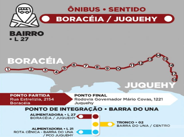 São cerca de 15km de distância entre os dois bairros que ficam no extremo da Costa Sul de São Sebastião. No sentido Boracéia/Juquehy, o ponto de partida é na Rua Estrelizia, nº2154, já o ponto final é na Rodovia Governador Mário Covas, nº1221. São 18 pontos dentro do percurso em direção a Juquehy e com destino para Boracéia são 13 pontos.