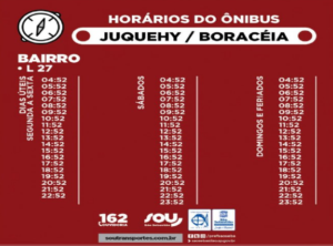 Essa é uma das linhas mais importantes do Novo Sistema de Transporte Urbano, pois interliga os munícipes que buscam ir para o Centro da cidade. Durante os dias úteis e finais de semana, os ônibus da linha têm intervalos de uma em uma hora, sendo o primeiro horário sempre às 4h25 e o último no meio de semana é às 22h25. No final de semana, tem o horário das 23h25. De Juquehy para Boracéia, os horários são das 4h52 até 22h52 e nos finais de semana das 4h52 até às 23h52.