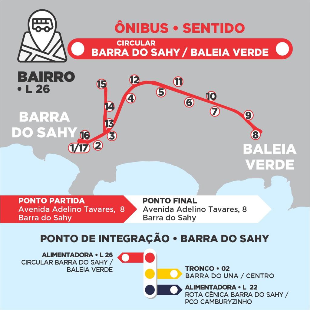 A linha L26 é uma das 14 linhas que fazem parte do Novo Sistema de Transporte Urbano de São Sebastião. A L26 realiza o trajeto do bairro Barra do Sahy ao de Baleia Verde, passando por 17 pontos de ônibus tanto na ida como na volta. Vale lembrar que a linha faz conexão com a Tronco 2 (Barra do Una/Centro) e a L22 (rota cênica Barra do Sahy/Camburyzinho).