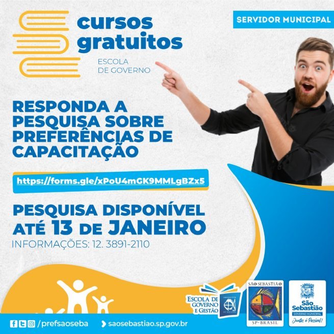 A Prefeitura de São Sebastião, por meio da Escola de Governo e Gestão, vinculada à Secretaria de Planejamento (SEPLAN), solicita aos servidores municipais que respondam até sexta-feira (13) pesquisa sobre preferências de capacitações, a fim de organizar a agenda de cursos e formações a serem ofertados durante o ano. Para acessar a pesquisa, clique AQUI.
