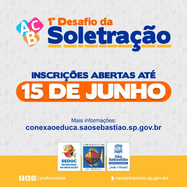 A Prefeitura de São Sebastião, por meio da Secretaria da Educação (SEDUC), está organizando o 1º Desafio de Soletração para alunos da rede municipal. As escolas interessadas em participar podem se inscrever até o dia 15 de junho.