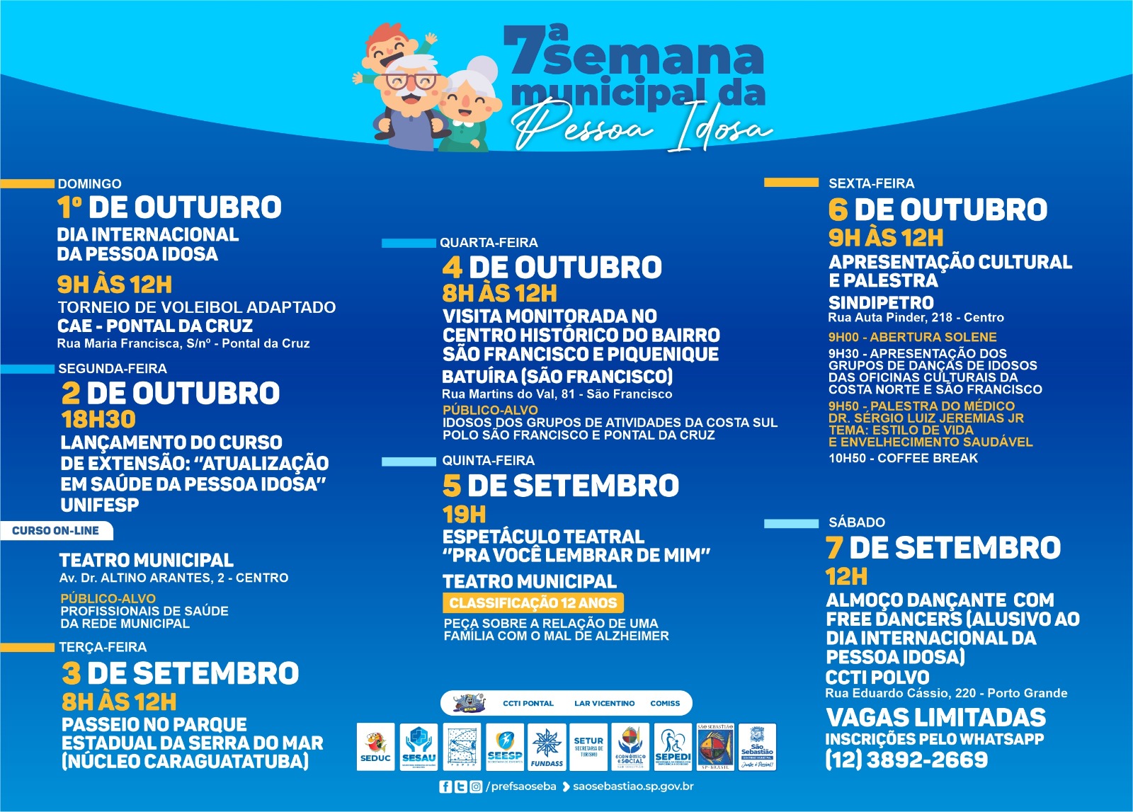 A 7ª Semana Municipal da Pessoa Idosa de São Sebastião será realizada de 1º a 7 de outubro de 2023. Para isso, a Prefeitura, por meio da Secretaria da Pessoa com Deficiência e do Idoso (SEPEDI), e o Conselho Municipal do Idoso (COMISS), realizaram uma programação especial para receber os grupos da melhor idade.