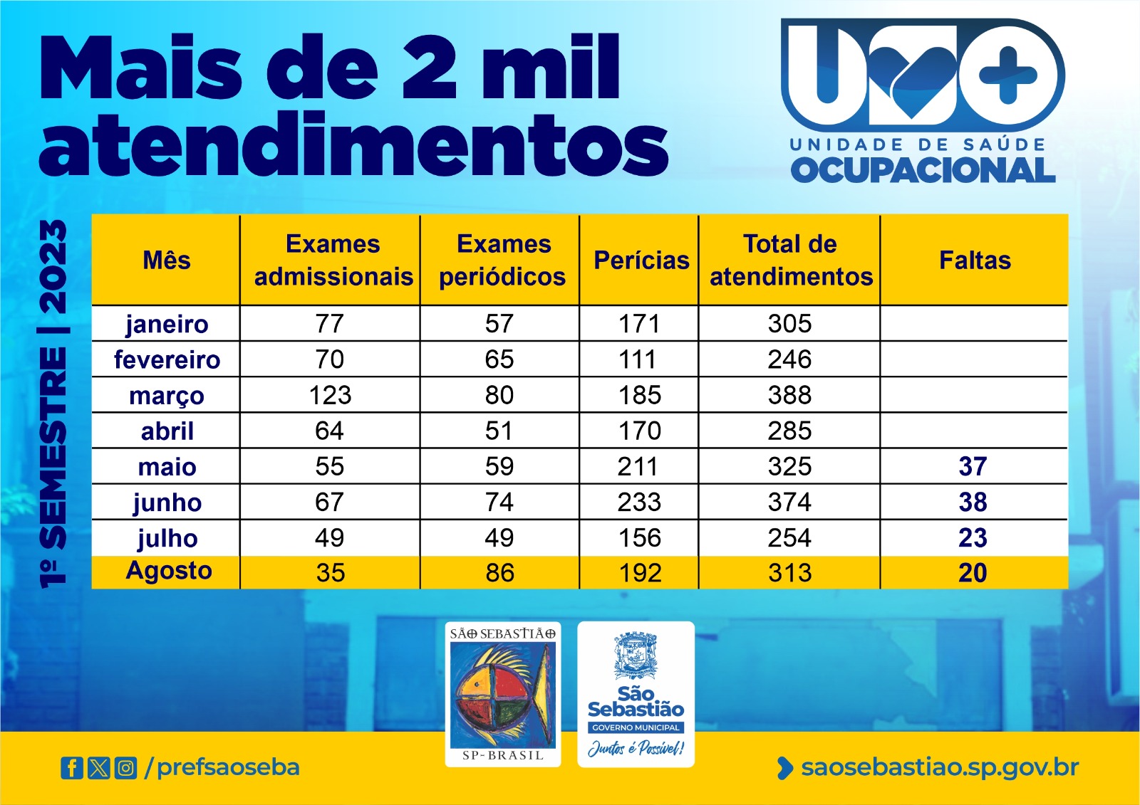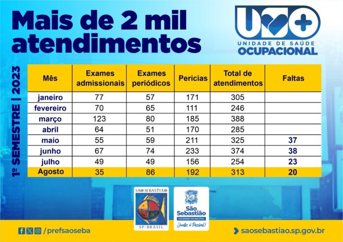 A Unidade de Saúde Ocupacional (USO) da Prefeitura de São Sebastião realizou mais de dois mil atendimentos no primeiro semestre deste ano. A USO, vinculada à Secretaria de Administração (SECAD), oferece uma série de serviços destinados a servidores públicos municipais.