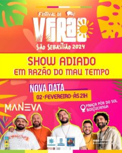 Em razão do mau tempo em São Sebastião e pensando na segurança dos munícipes e visitantes, a Prefeitura, por meio da Secretaria de Turismo (SETUR) e da Fundação Educacional e Cultural ‘Deodato Sant’Anna’ (Fundass), também decidiu adiar os shows que seriam realizados nesta sexta-feira (26), no Festival de Verão de São Sebastião 2024.