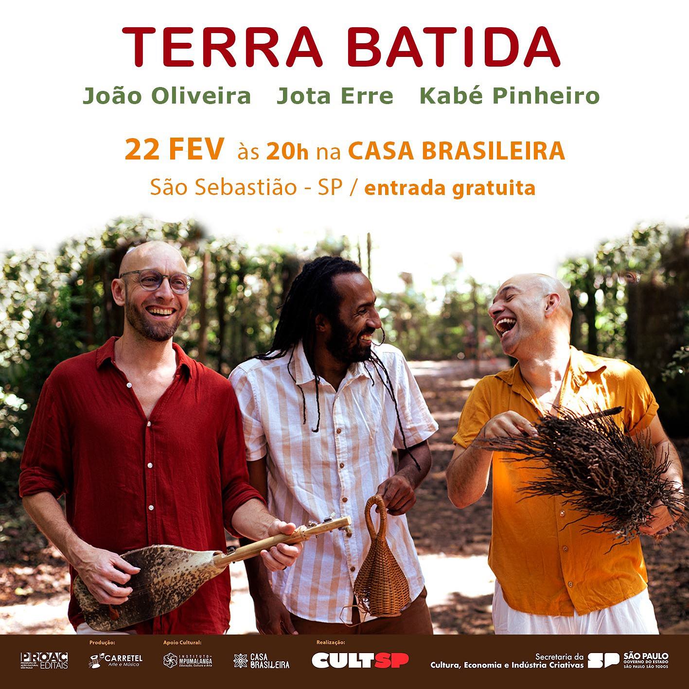 Na próxima quinta-feira (22), às 20h, os músicos João Oliveira, Jota Erre e Kabé Pinheiro realizam o primeiro show da temporada de estreia do projeto musical ‘Terra Batida’, com entrada gratuita na Casa Brasileira, na Rua da Praia, no Centro Histórico de São Sebastião.
