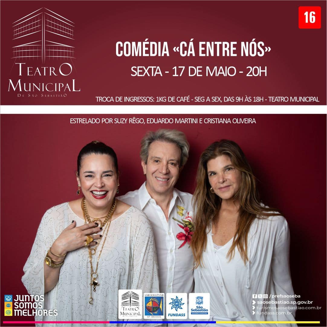 O Teatro Municipal de São Sebastião recebe, nesta sexta-feira (17), às 20h, a comédia ‘Cá Entre Nós’, estrelado por Suzy Rêgo, Cristiana Oliveira e Eduardo Martini, que também assina a direção.
