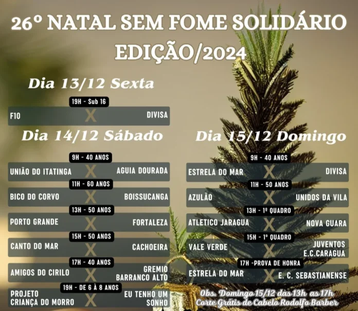 Neste final de semana, ocorre a 26ª Edição do Natal Sem Fome Solidário, projeto que é apoiado pela Prefeitura de São Sebastião, por meio das Secretarias de Esportes (SEESP), em conjunto com o Fundo Social Municipal. O evento ocorrerá na sexta-feira (13), a partir das 19h; no sábado (14) e domingo (15), com início às 9h, no Campo Estrela do Mar, no Jaraguá.
