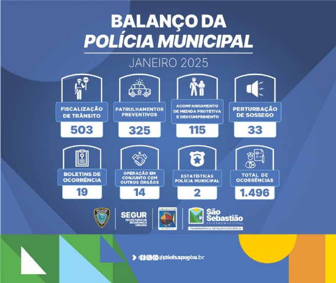 Balanço realizado pela Polícia Municipal de São Sebastião aponta o registro de cerca de 1.500 ocorrências no mês de janeiro de 2025. A corporação é vinculada à Secretaria de Segurança Urbana (Segur) e o apoio ao Departamento de Trânsito em fiscalização foi o que teve maior atuação com 503 atendimentos. Em seguida vem o Patrulhamento Preventivo com registro de 325 atendimentos.