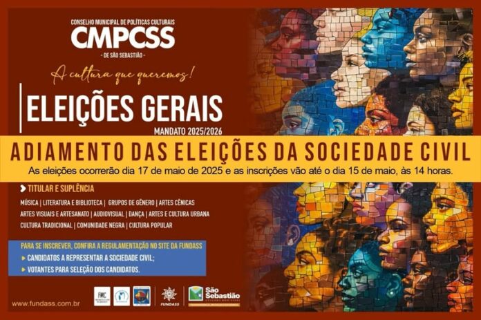 A Fundação Educacional e Cultural ‘Deodato Sant’Anna’ (Fundass) e a Comissão Permanente de Eleições do Conselho Municipal de Políticas Culturais de São Sebastião (CMPC-SS) informa que as Eleições da sociedade civil para o mandato 2025/2026 do CMPC-SS, inicialmente agendadas para o dia 26 de abril, foram adiadas.
