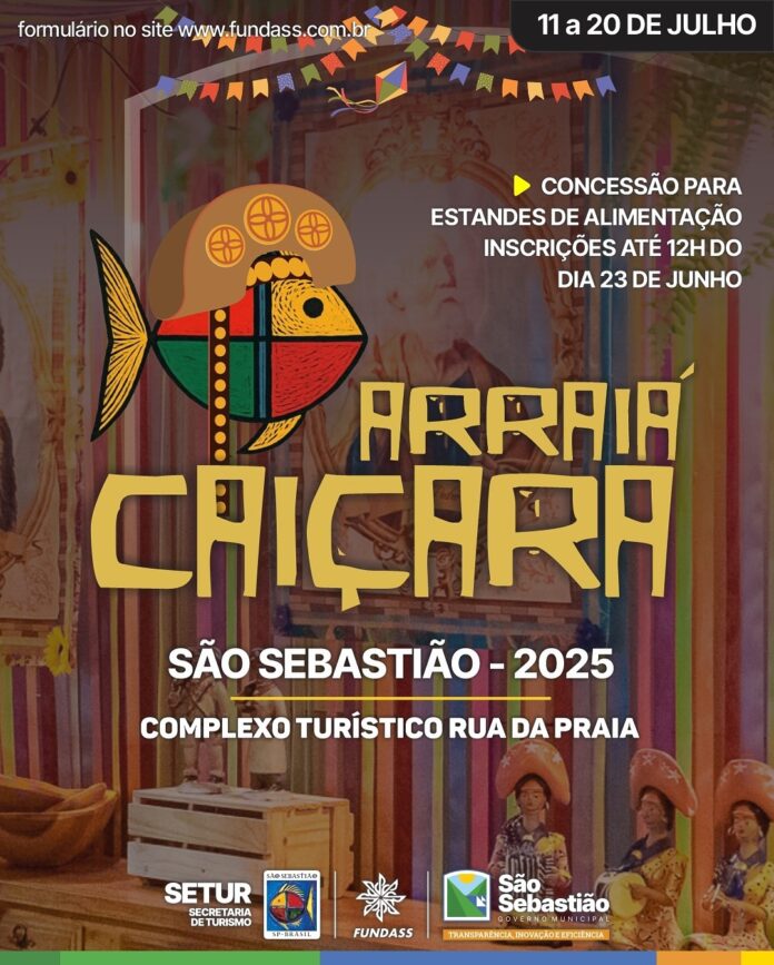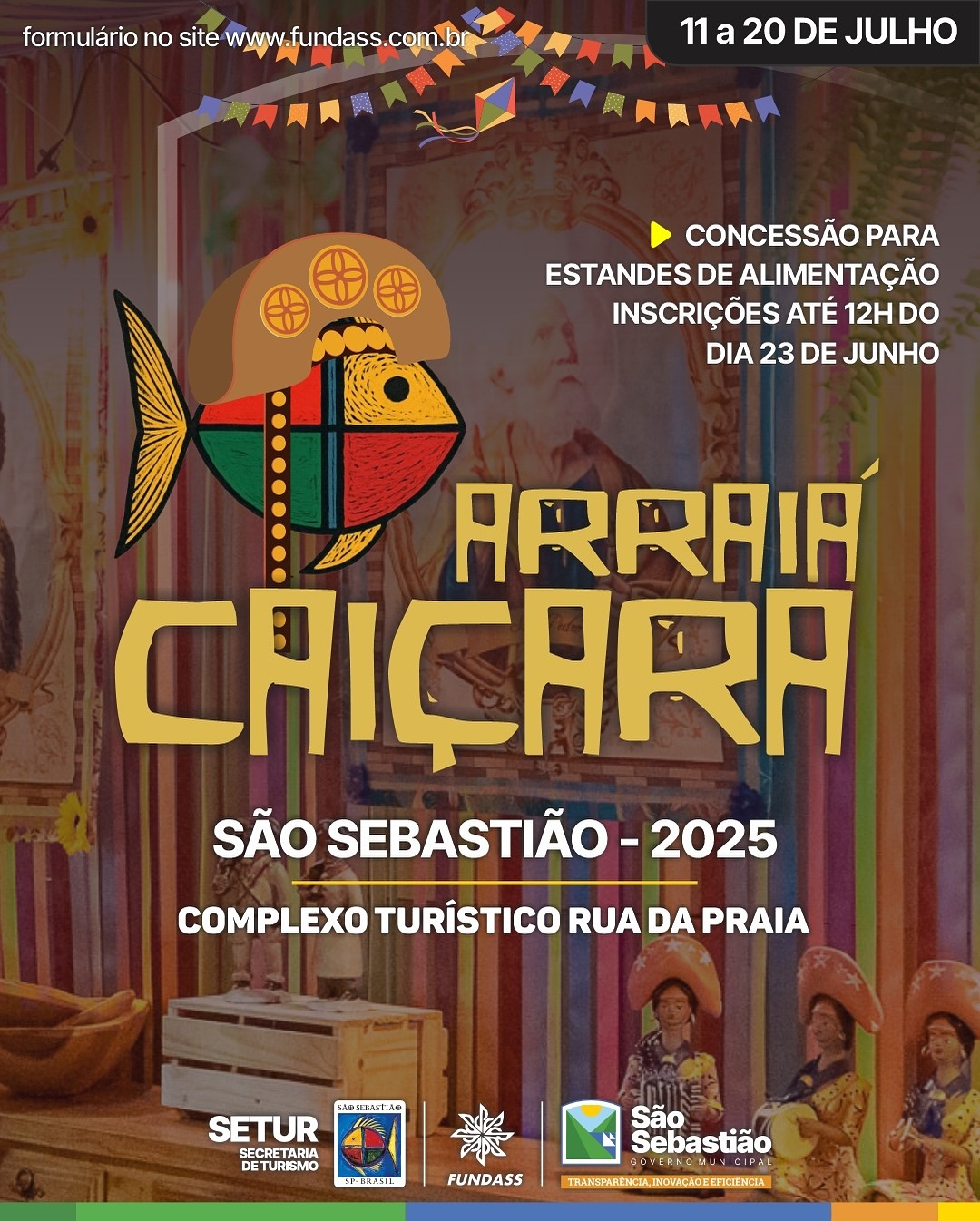 Seguem abertas as inscrições da concessão de estandes para comercialização de alimentos tradicionais durante o Arraiá Caiçara de São Sebastião 2025, que ocorrerá de 11 a 20 de julho, no Complexo Turístico da Rua da Praia, no Centro Histórico.