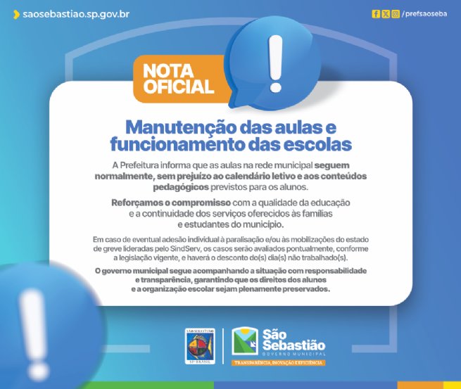 A Prefeitura de São Sebastião informa que as aulas na rede municipal seguem normalmente, sem prejuízo ao calendário letivo e aos conteúdos pedagógicos previstos para os alunos.