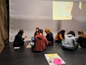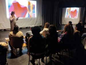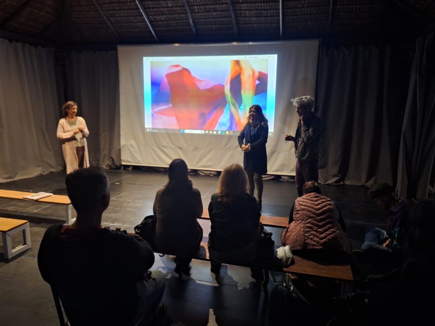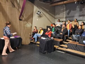 Durante a oficina, Isabel conduziu uma conversa aberta sobre como traduzir, por meio da cenografia, uma cena teatral, explorando aspectos como texto, artes visuais, personagens, atuação, espaço e iluminação. A proposta reforça o papel do professor como agente criativo no processo pedagógico e cultural das escolas.