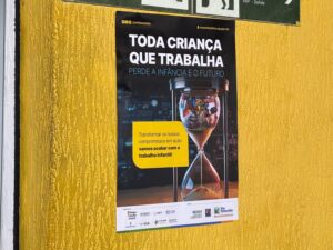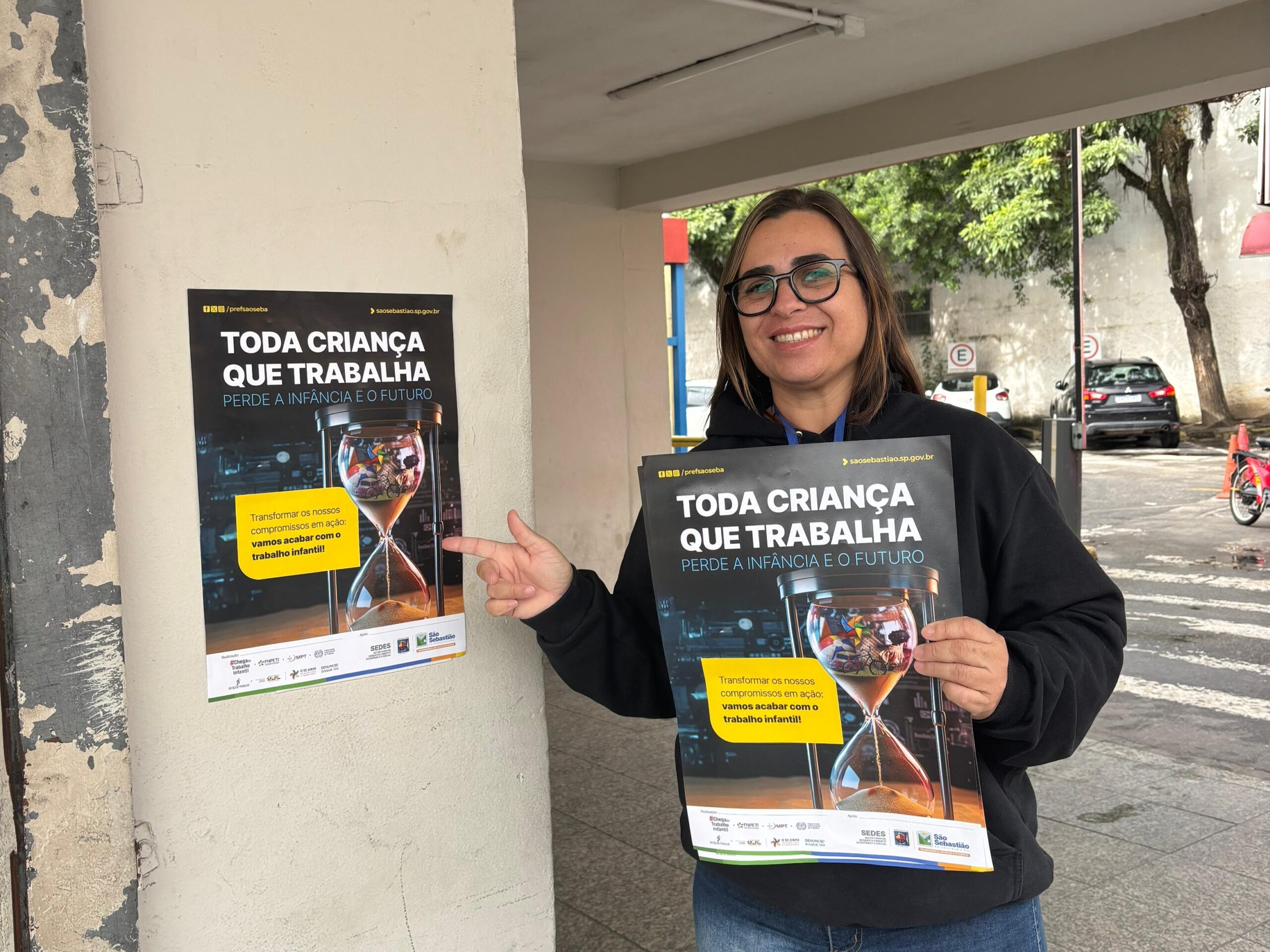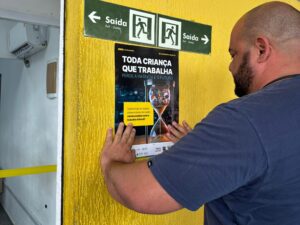 A ação incluiu a distribuição de panfletos informativos e afixação de cartazes em estabelecimentos da região central, alertando para os prejuízos causados pelo trabalho infantil e reforçando o compromisso do município com a proteção dos direitos de crianças e adolescentes.