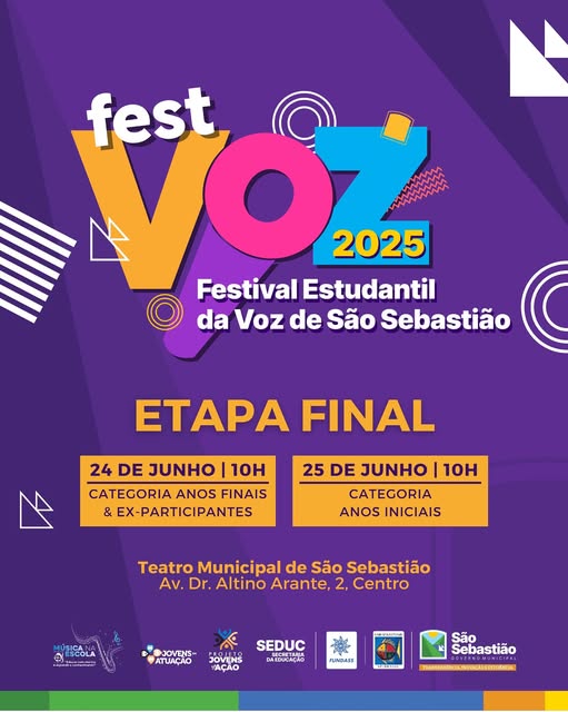 Com o objetivo de valorizar os talentos musicais de alunos da rede municipal de ensino, a Prefeitura de São Sebastião, por meio da Secretaria da Educação (Seduc), realiza nos dias 24 e 25 de junho, às 10h, no Teatro Municipal, a grande final e cerimônia de premiação do Festival Estudantil da Voz – FestVoz 2025.