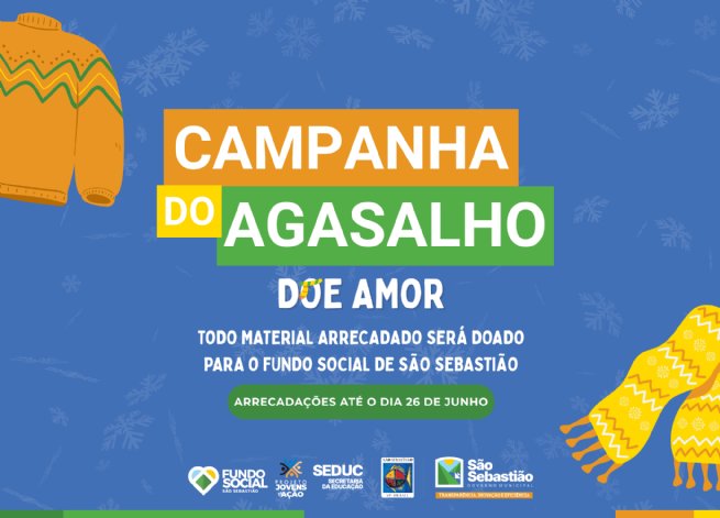 A Prefeitura de São Sebastião, por meio da Secretaria da Educação (Seduc) e do Projeto Jovens em Ação, está promovendo uma Campanha do Agasalho com arrecadações até o dia 26 de junho. A ação tem como objetivo mobilizar as comunidades escolares em prol da arrecadação de roupas de frio, que serão doadas ao Fundo Social de Solidariedade do município.