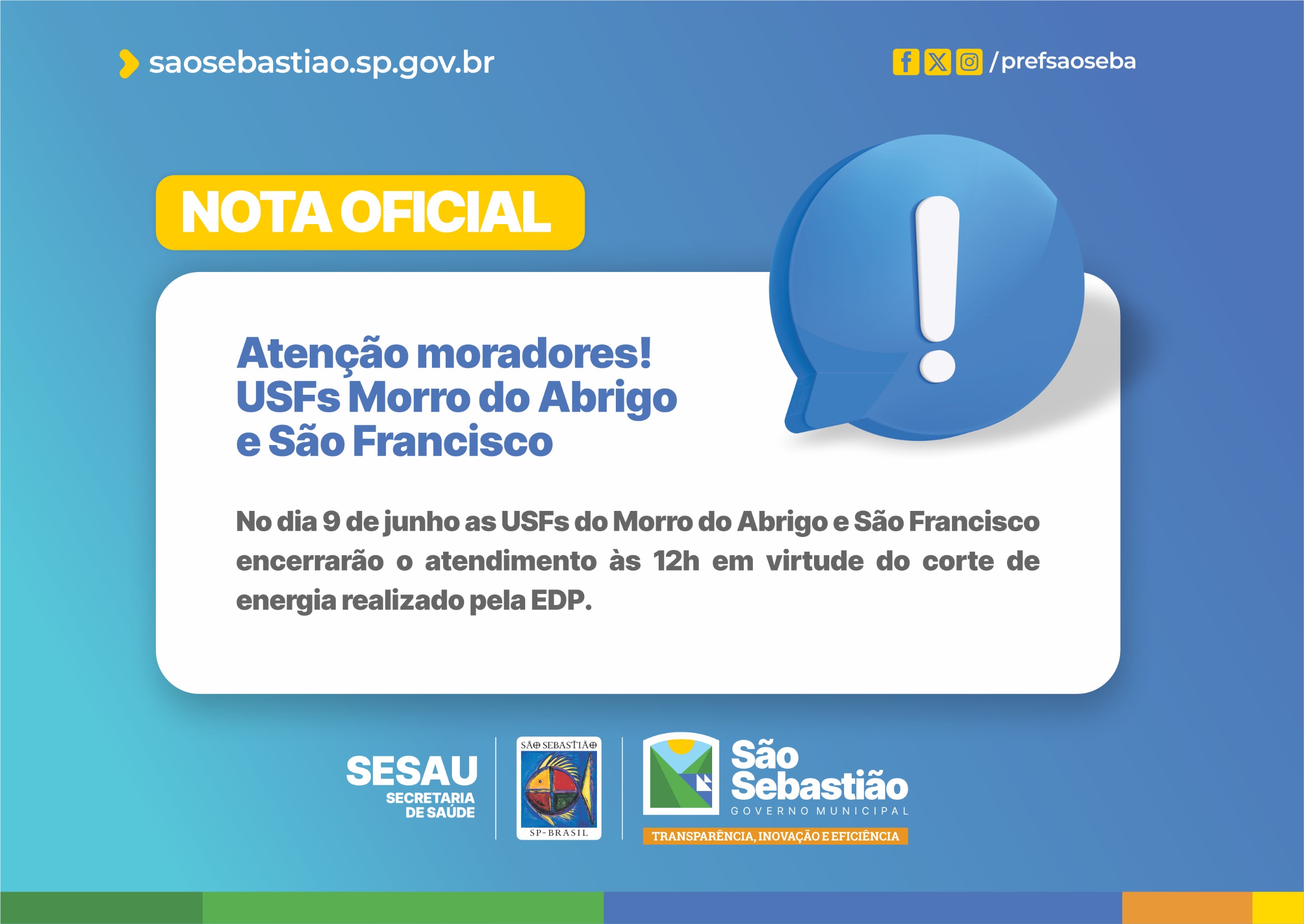 A Prefeitura de São Sebastião, por meio da Secretaria de Saúde (Sesau) e da Fundação de Saúde Pública de São Sebastião (FSPSS), vai realizar uma alteração no horário de funcionamento das Unidades de Saúde da Família (USFs) do Morro do Abrigo e São Francisco, na próxima segunda-feira (9/6), em virtude de um corte de energia realizado pela concessionária EDP.