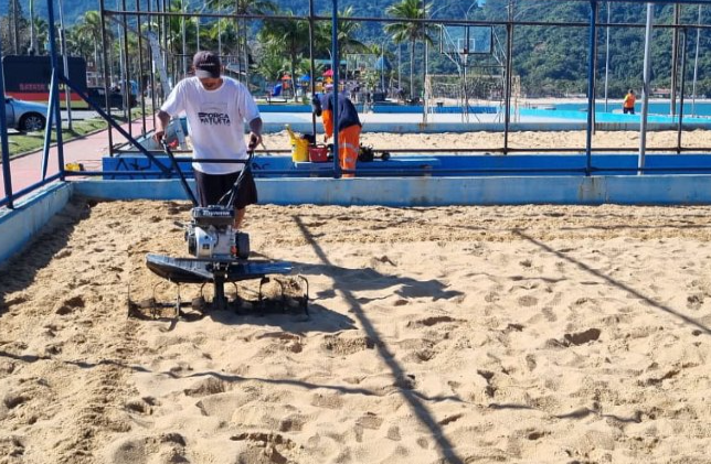 Nos primeiros trabalhos, as equipes de manutenção da Seesp executaram a limpeza geral da quadra de areia e remoção das pedras com equipamento e trabalho manual.