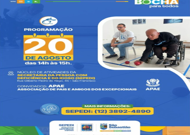 O ‘Bocha para Todos’ será realizado no Núcleo de Atividades da Sepedi, situado à Rua Gilberto Pedro do Rego, 45, no bairro São Francisco, região central de São Sebastião, às 14h.