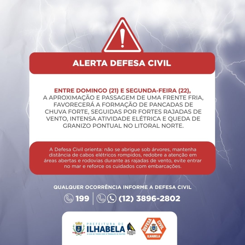 A Prefeitura de Ilhabela, por meio da Defesa Civil, informa que entre domingo (21) e segunda-feira (22) está prevista a atuação de uma frente fria sobre o Litoral Norte.