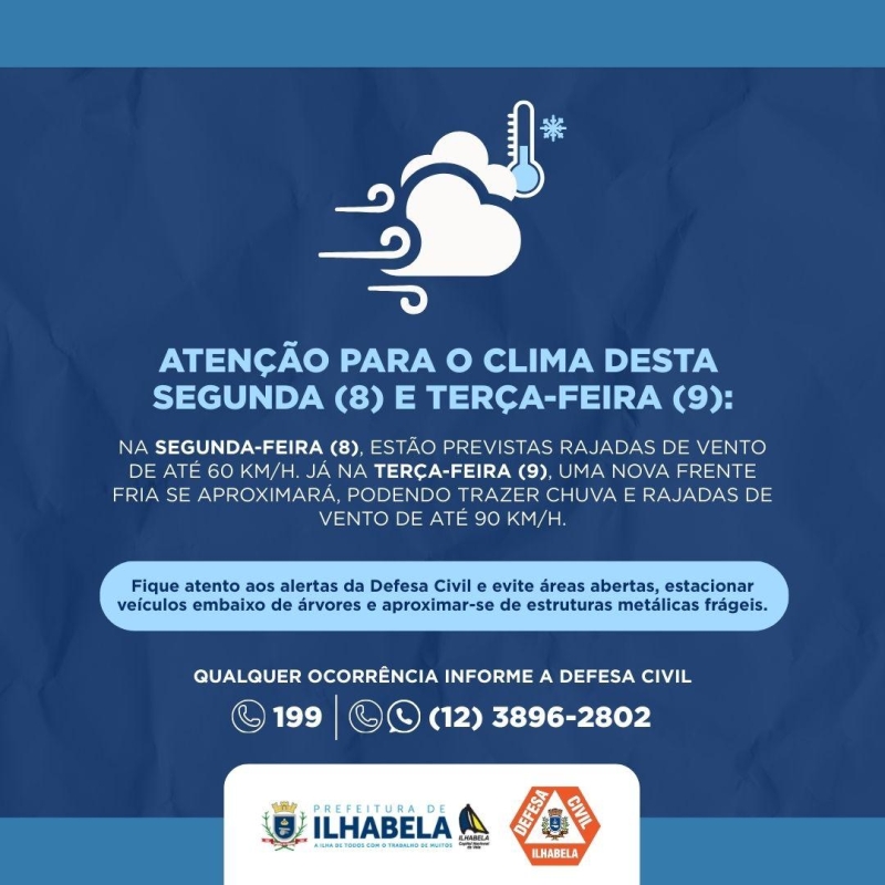 A Prefeitura de Ilhabela, por meio da Defesa Civil Municipal, alerta para a previsão de rajadas de vento de até 60 km/h na segunda-feira (8). Na terça-feira (9) uma nova frente fria deve se aproximar da cidade e, por isso, são esperadas rajadas de vento ainda maiores, de até 90 km/h, acompanhadas de chuva.