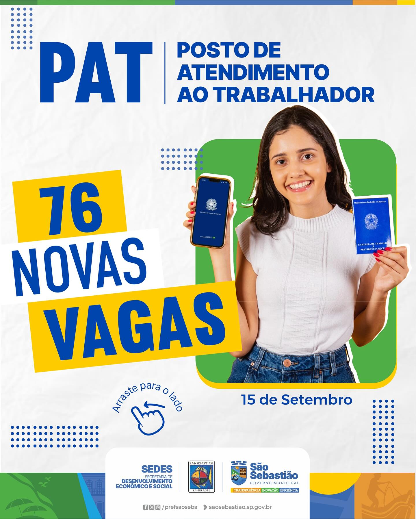 O Posto de Atendimento ao Trabalhador (PAT) de São Sebastião abre a segunda-feira (15/9) com 76 vagas de empregos, distribuídas entre 40 diferentes funções e regiões do município. O Posto de Atendimento ao Trabalhador (PAT) é vinculado à Secretaria de Desenvolvimento Econômico e Social (Sedes) da Prefeitura de São Sebastião.
