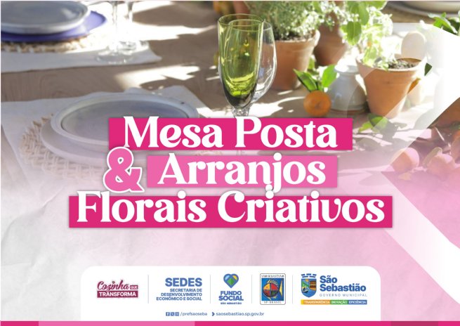 A Prefeitura de São Sebastião, por meio da Secretaria de Desenvolvimento Econômico e Social (Sedes), em parceria com o Fundo Social, realiza na próxima terça-feira (16/9) e na quinta-feira (18/9), a primeira edição do Workshop de Mesa Posta & Arranjos Florais Criativos, com a especialista Mara Perez. O curso será realizado no Centro Integrado Profissionalizante (CIP), no bairro Topolândia, das 14h às 17h.