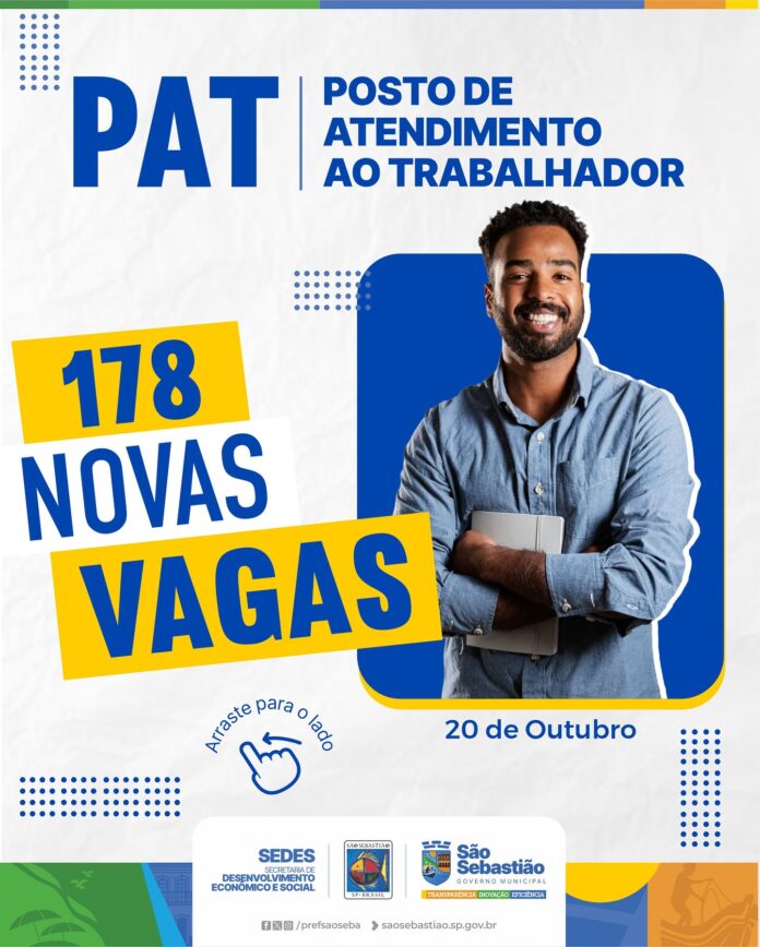 O Posto de Atendimento ao Trabalhador (PAT) de São Sebastião inicia esta segunda-feira (20/10) com 178 vagas de emprego disponíveis, distribuídas em 75 funções e diferentes regiões do município.