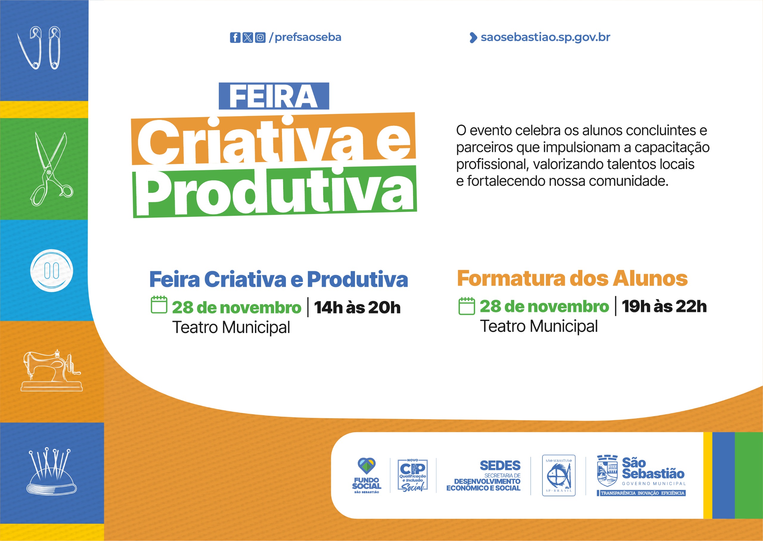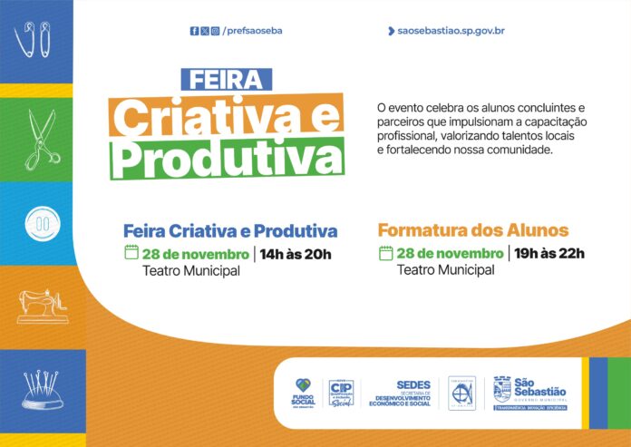 A Prefeitura de São Sebastião, por meio da Secretaria de Desenvolvimento Econômico e Social (Sedes) e do Centro Integrado Profissionalizante (CIP), realiza nesta sexta-feira (28/11) a Feira Criativa e Produtiva, juntamente com a cerimônia de formatura das turmas concluintes de 2025, no Teatro Municipal.