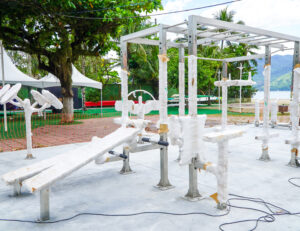 Os aparelhos da academia ao ar livre são de inox, material apropriado para o clima do Litoral Norte e adequados com meio ambiente. A academia pode ser utilizada por pessoas de todas as idades.