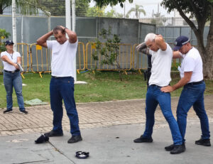 Durante a atividade, os instrutores orientaram os aspirantes em exercícios práticos realizados em dupla, simulando situações de abordagem, com um agente responsável pela ação direta e outro pelo apoio, incluindo a utilização de armamento.