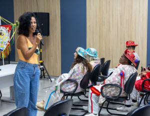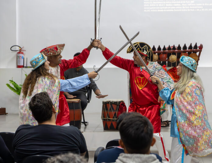 A formação foi conduzida pela professora e historiadora Fernanda Palumbo, que apresentou aos educadores aspectos históricos e simbólicos da Congada, manifestação cultural que reúne canto, dança, teatro e religiosidade, unindo elementos da tradição cristã e de matriz africana.