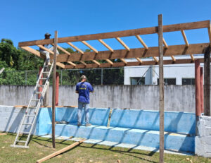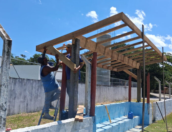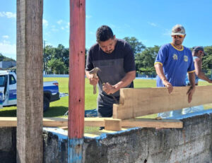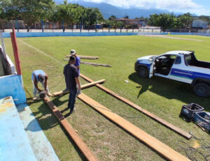 Entre os serviços em andamento estão a reforma das colunas danificadas, a substituição completa do alambrado, a instalação de cobertura nos bancos de reservas, além de pintura geral e roçada da área. O material foi fornecido pela Secretaria de Esportes, enquanto a execução dos serviços é realizada pela equipe da Sesep.