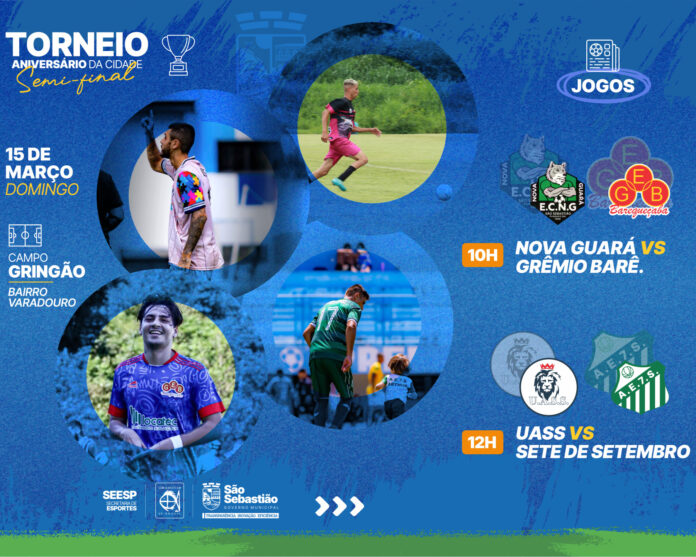 As equipes de futebol de São Sebastião Nova Guará, Grêmio Barequeçaba, UASS e Sete de Setembro se classificaram para disputar as semifinais do Torneio de Aniversário de São Sebastião 2026. As quatro agremiações venceram nas quartas de final e buscam uma vaga na decisão no Estádio Municipal Otoniel Santos, neste domingo (15), a partir das 10h.