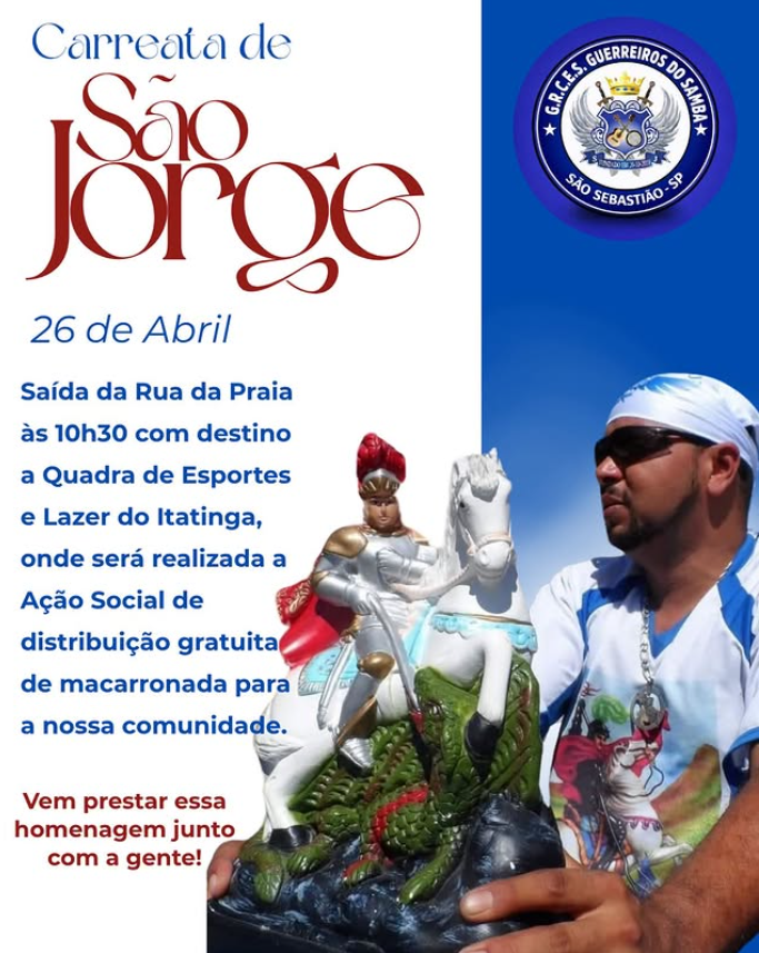 A comunidade do bairro Itatinga, em São Sebastião, se prepara para viver mais uma grande demonstração de fé, tradição e solidariedade neste domingo, dia 26 de abril de 2026, com a realização da tradicional Carreata em Homenagem a São Jorge, organizada pelo Grêmio Recreativo Carnavalesco Escola de Samba Guerreiros do Samba.