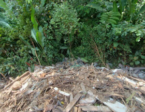 Também foi verificado o descarte inadequado de entulho, composto por materiais não segregados, como plástico, madeira, vergalhões metálicos e outros resíduos da construção civil, lançados diretamente sobre a vegetação existente nas bordas do aterro.