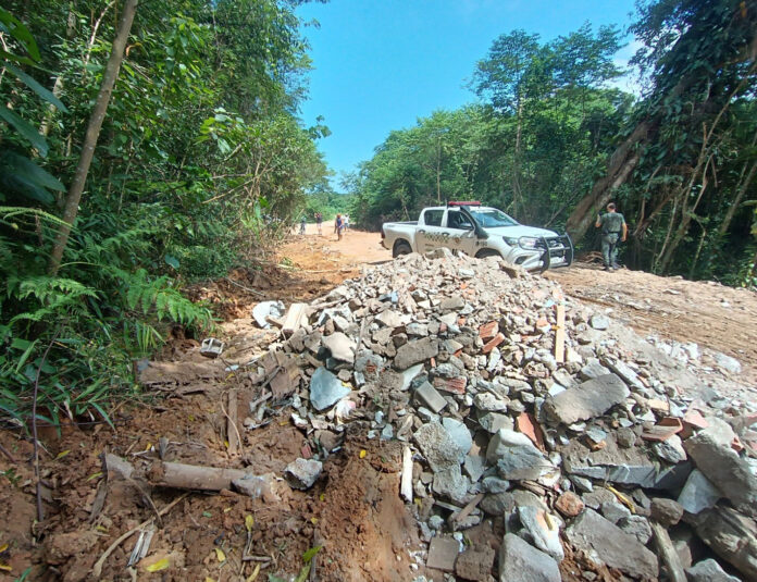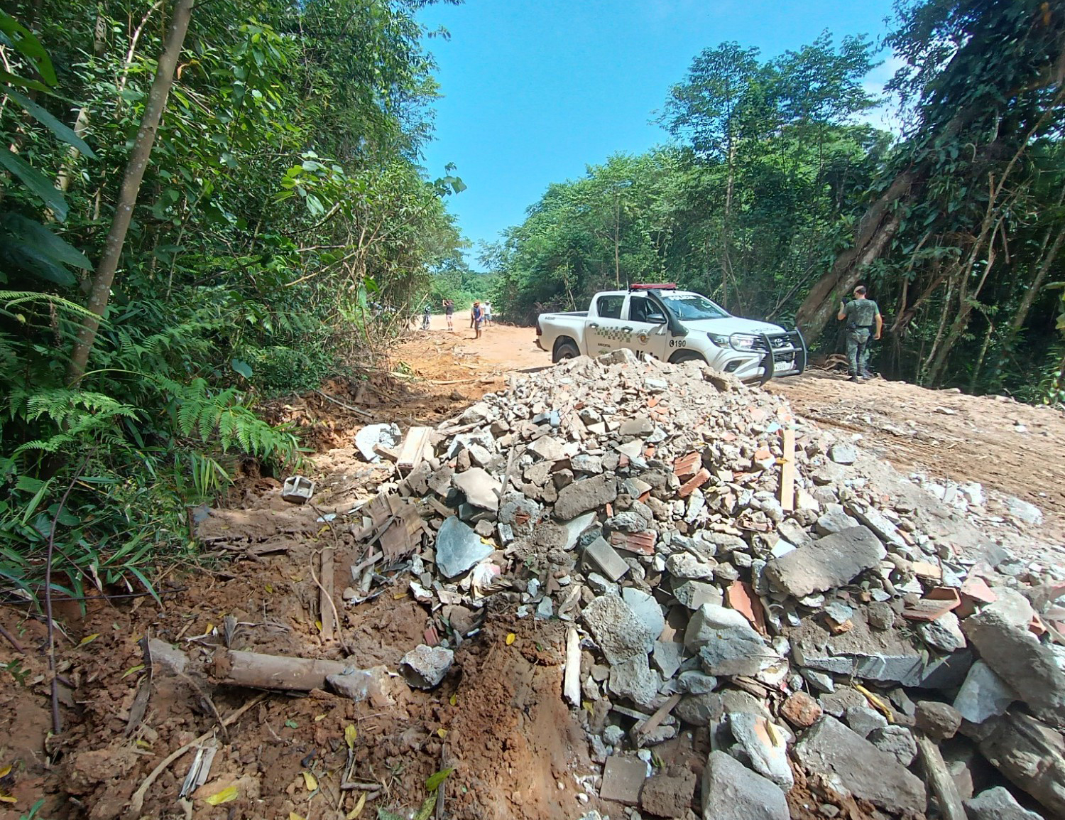 O volume de terra e resíduos varia ao longo da via, chegando, em alguns pontos, a ultrapassar dois metros de altura em relação ao solo natural. Outro fator de preocupação é a presença de pelo menos três cursos d’água ao longo do trecho, sendo que um deles foi canalizado por meio de tubulação de concreto sob o caminho aterrado.