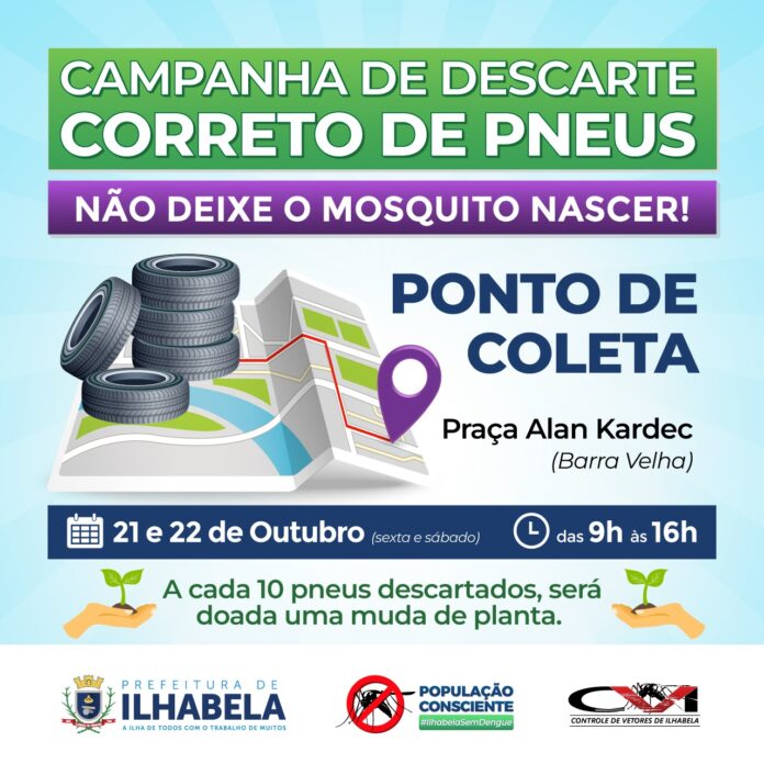A campanha “Descarte Correto de Pneus” é promovida pela Prefeitura de Ilhabela, por meio da Secretaria de Saúde – Departamento de Controle de Vetores e apoio da Secretaria de Meio Ambiente e Secretaria de Serviços Urbanos.