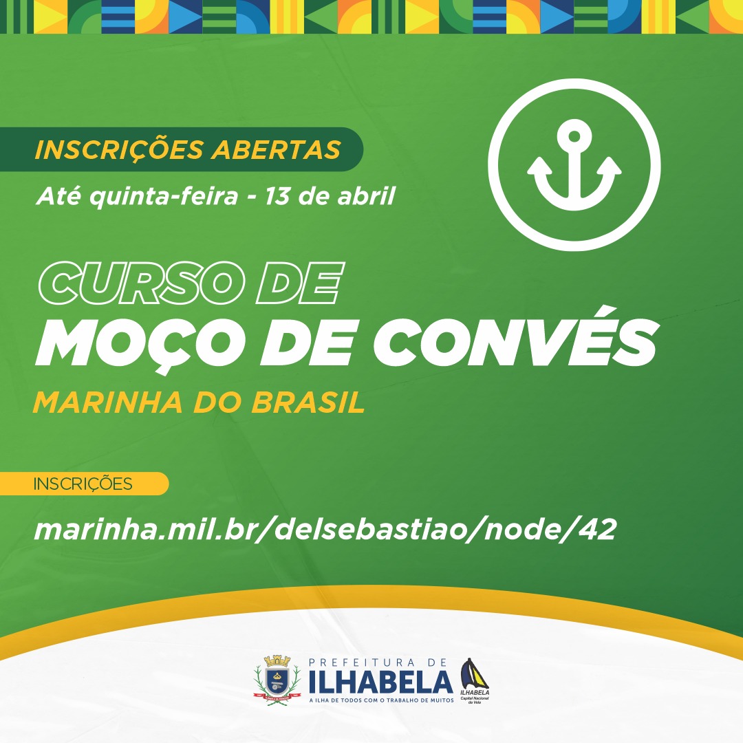 Até esta quinta-feira, 13 de abril, a Marinha do Brasil recebe inscrições do processo seletivo de admissão para o curso de formação de Aquaviários – Moço de Convés, que tem por objetivo capacitar os profissionais da área náutica, no auxílio da operação, manutenção, conservação e limpeza de equipamentos e instalações de embarcações.